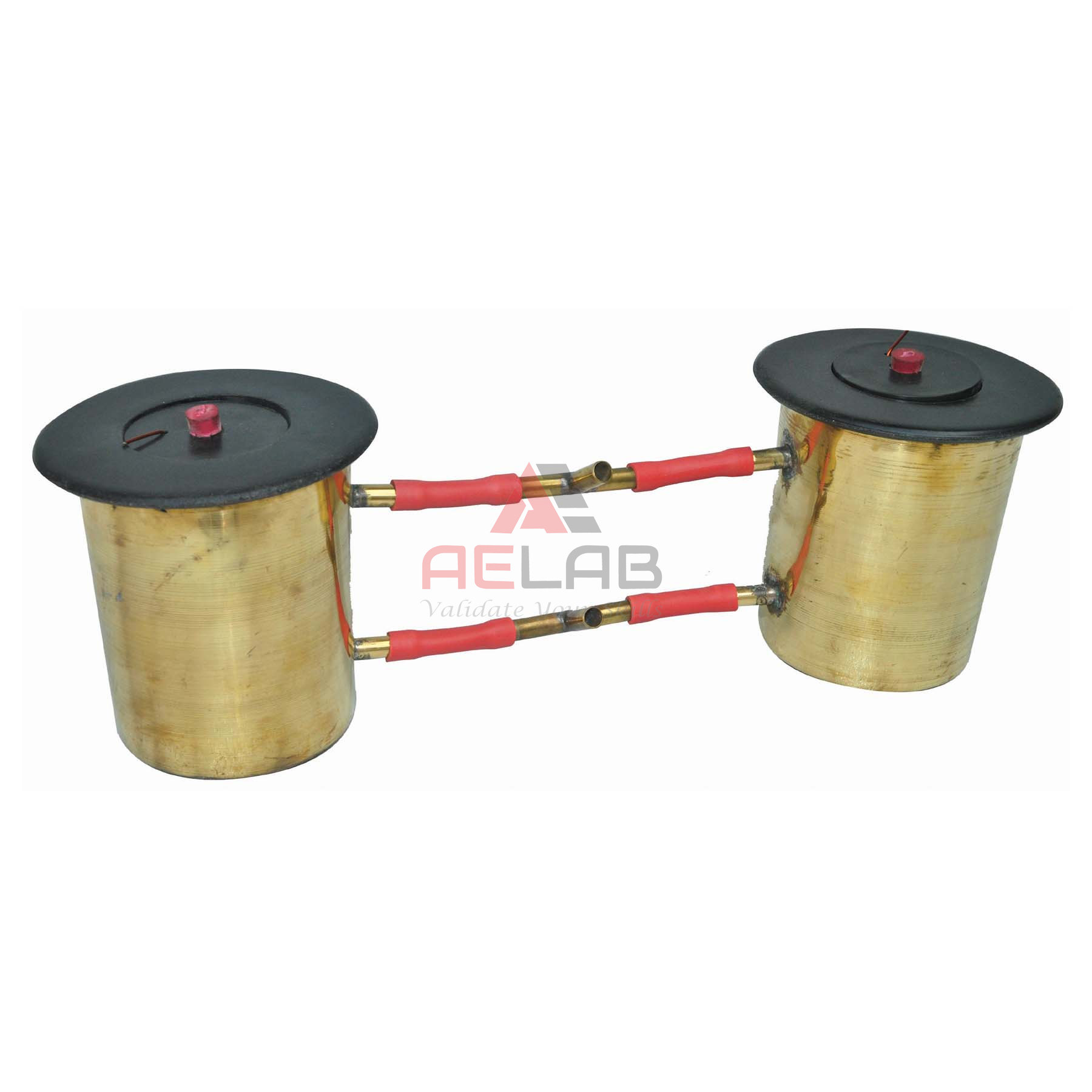 Two aluminum calorimeters are hung inside a double walled metal tank fitted with a wooden top with 2 holes for thermometers.