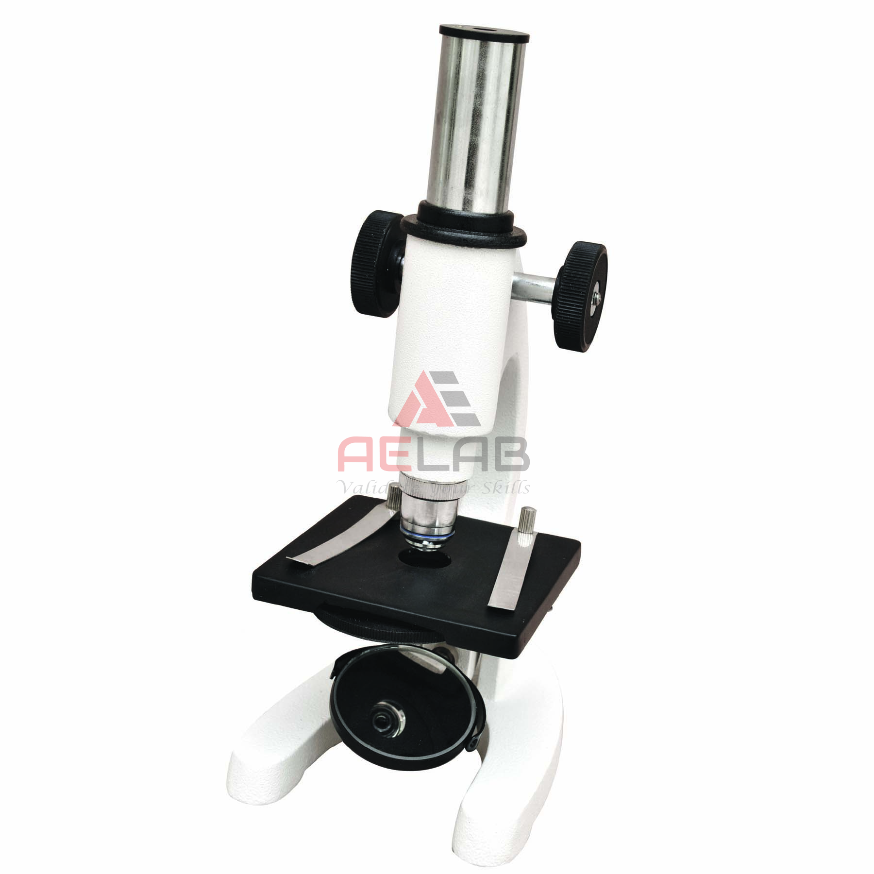 It has a cast iron base and inclinable body, coarse motion is through rack & pinion, supplied with 10x objective and 10x eye piece, stage is fitted with iris diaphragm, underneath and stage clip on it, packed in thermocole box.
