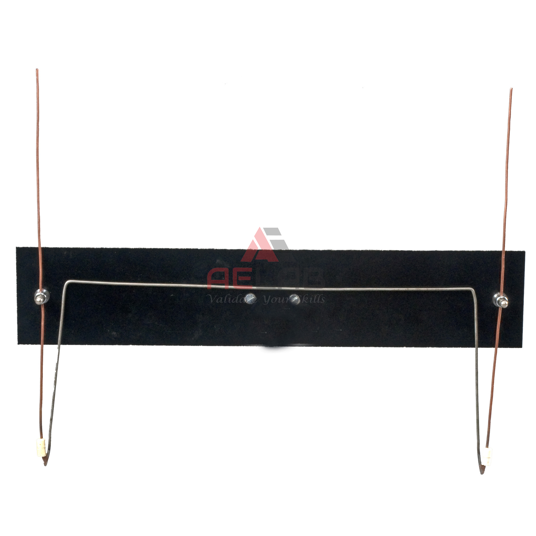 Copper constantan thermocouple of thick wire mounted on Bakelite strip, provided with two terminals and clamp for mounting on stand.