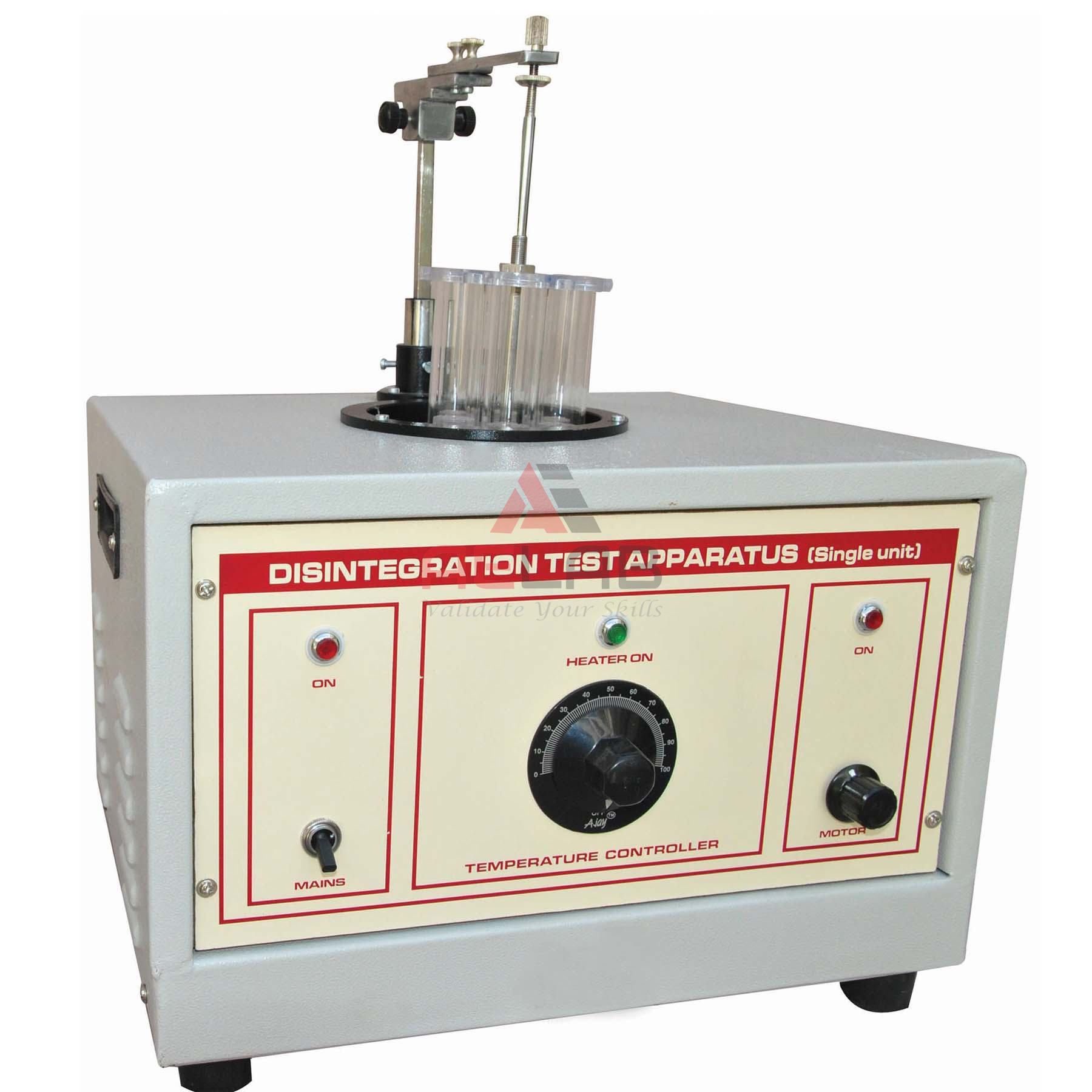 Tablet-disintegration with single disc with six removable glass vessels have a stainless steel wire mesh bottom, which dip in water in a beaker of 1000 ml kept on the hot plate, temperature of which is maintained 370_c with an accuracy of ±10_c.